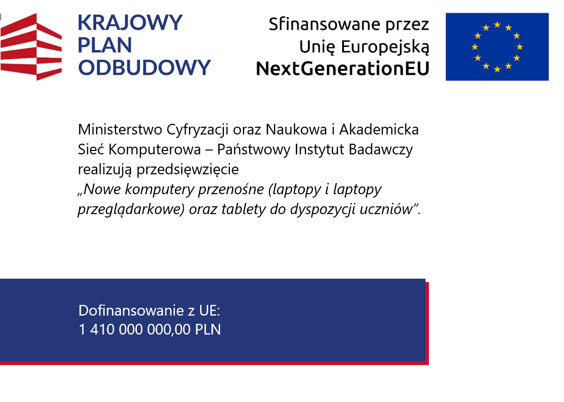 Inwestycja jest realizowana w ramach programu finansowanego ze środków Krajowego Planu Odbudowy i Zwiększania Odporności przez Ministerstwo Cyfryzacji oraz Naukową i Akademicką Sieć Komputerową – Państwowy Instytut Badawczy.