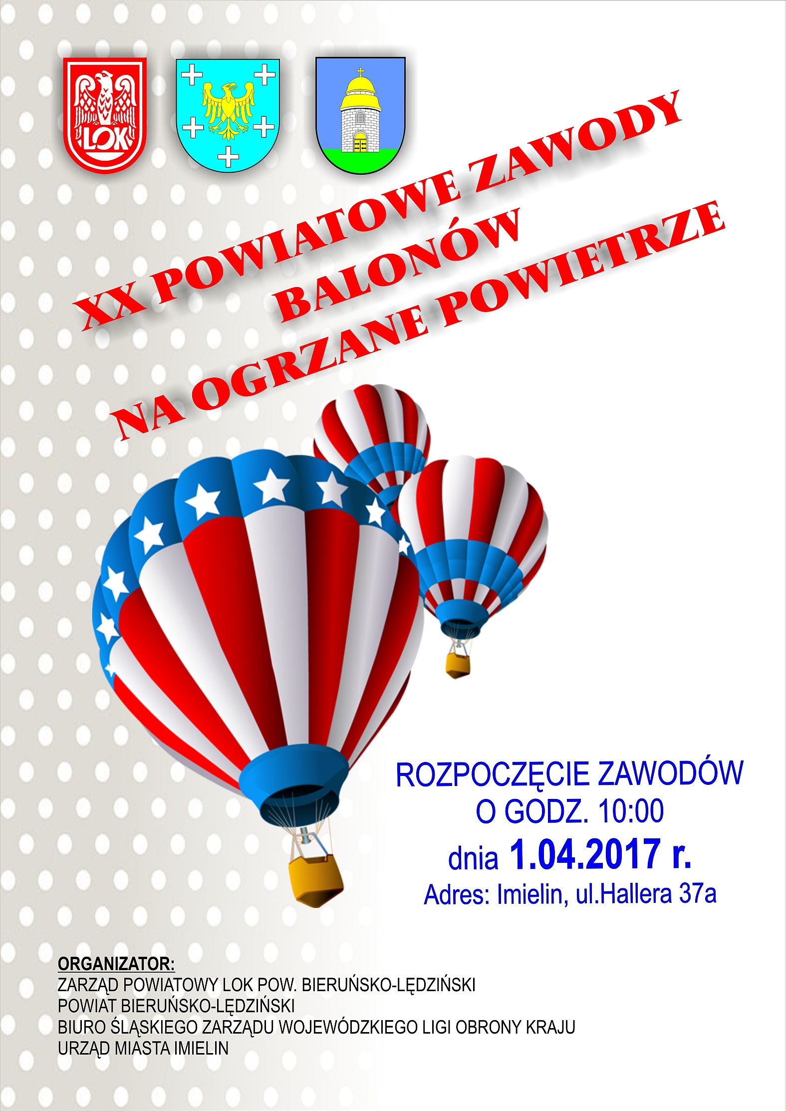 Zapraszamy 1 kwietnia 2017 roku na jubileuszowe XX Powiatowe Zawody Balonów na ogrzewane powietrze !! W programie Godz. 9.30 - Ocena balonów, przydzielenie numerów startowych. Godz. 10.00 - Otwarcie zawodów. Godz. 10.10 - Loty balonów Godz. 12.00 - Pokazy: Przy sprzyjających warunkach atmosferycznych - pokazy modeli samolotów zdalnie sterowanych Godz. 12.30 - Zakończenie lotów – Godz. 13.00 - Dekoracja zawodników, zakończenie zawodów