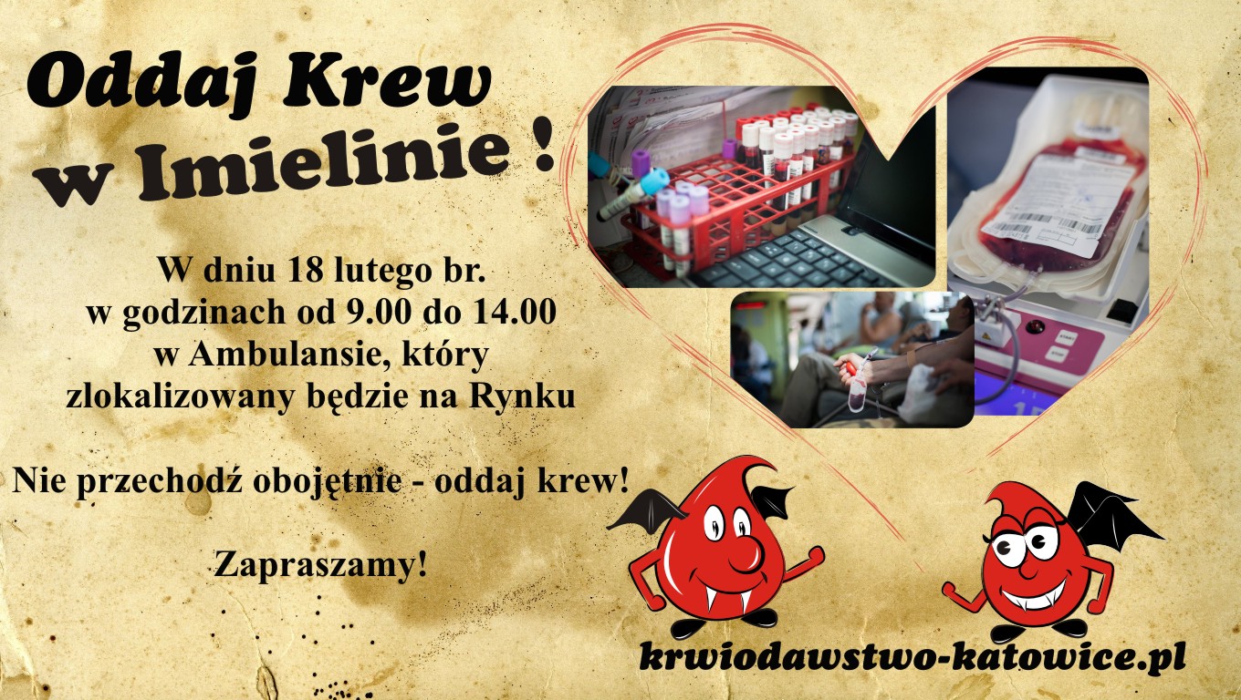 poniedziałek, 11 lutego 2013Oddaj krew - w dniu 18 lutego 2013 roku w godzinach od 9:00 do 14:00 w Ambulansie, który zlokalizowany będzie na Rynku.