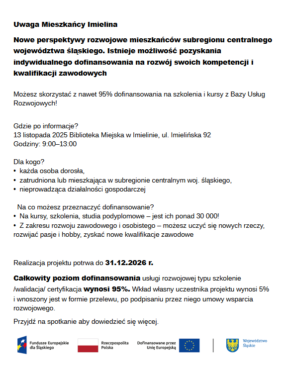 Uwaga Mieszkańcy Imielina ! dofinansowania na rozwój swoich kompetencji i kwalifikacji zawodowych