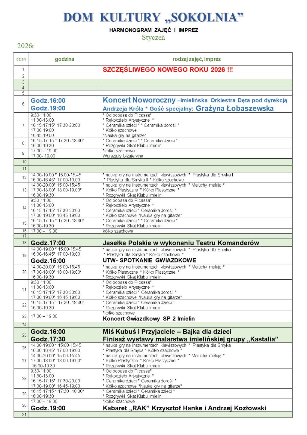 Zapraszamy do zapoznania się z harmonogramem zajęć i imprez w DK Sokolnia na miesiąc styczeń.