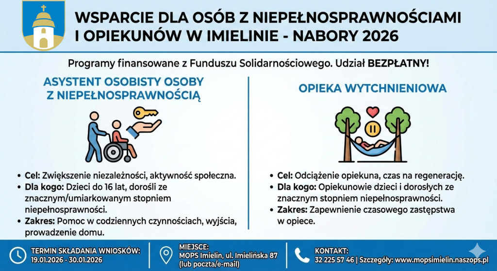 Miasto Imielin oraz Miejski Ośrodek Pomocy Społecznej ogłaszają rozpoczęcie naboru wniosków do dwóch kluczowych programów resortowych finansowanych ze środków Funduszu Solidarnościowego: „Asystent osobisty osoby z niepełnosprawnością” oraz „Opieka wytchnieniowa” – edycja 2026.